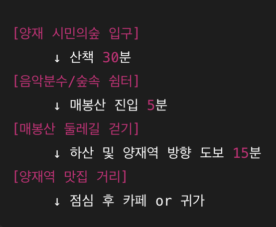 | 오후 12:30 | 하산 및 양재역 방향 이동 | 산책 종료, 식당 방향으로 이동 | 15분 |