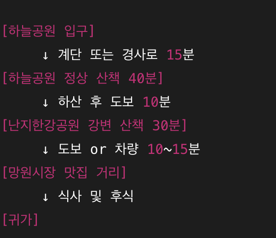 | 오후 12:05 | 난지한강공원 산책 | 벤치에서 휴식 or 자전거 대여 | 30분 |