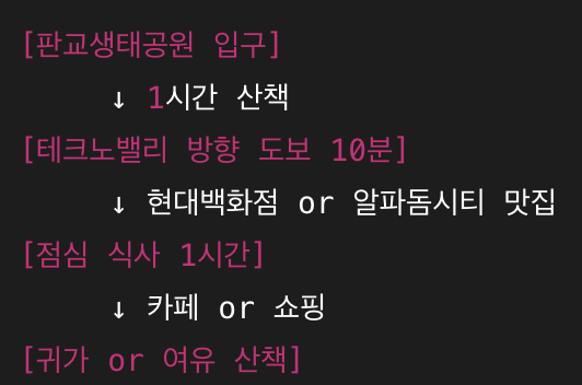 | 오후 12:00 | 테크노밸리 쪽으로 이동 | 현대백화점 방향 도보 이동 | 10분 |