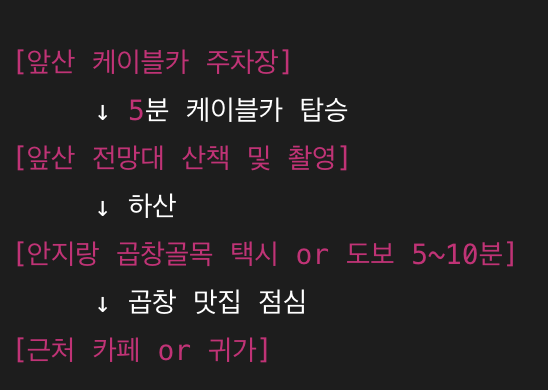 | 오후 12:00 | 안지랑 곱창골목 도착 | 대표 곱창 맛집에서 점심 식사 | 1시간 |