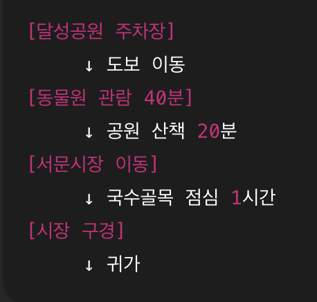 | 오전 11:00 | 달성공원 주차장 도착 | 입구~동물원 방향 이동 | 10분 |