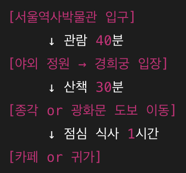 | 오전 11:50 | 경희궁 입장 | 전각 관람, 정원 산책, 사진 촬영 | 30분 |