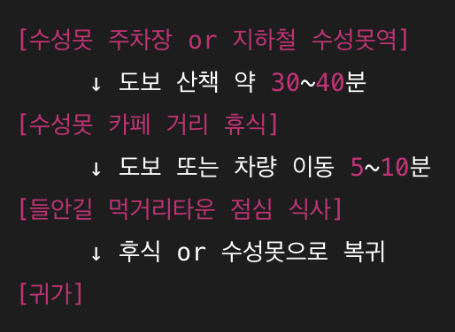 | 오전 11:00 | 수성못 도착 | 호숫길 산책, 벤치 휴식 | 40분 |